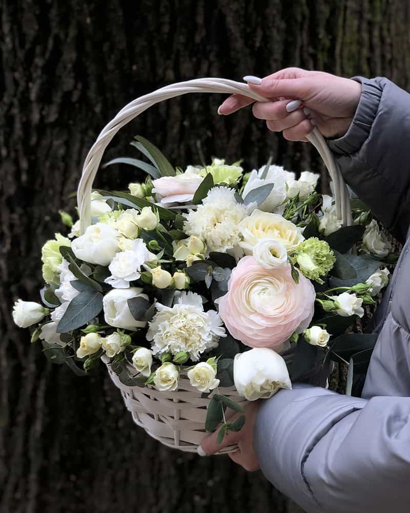 Корзина из микса белых цветов- нежное и уникальное решение для подарка близкому человеку.